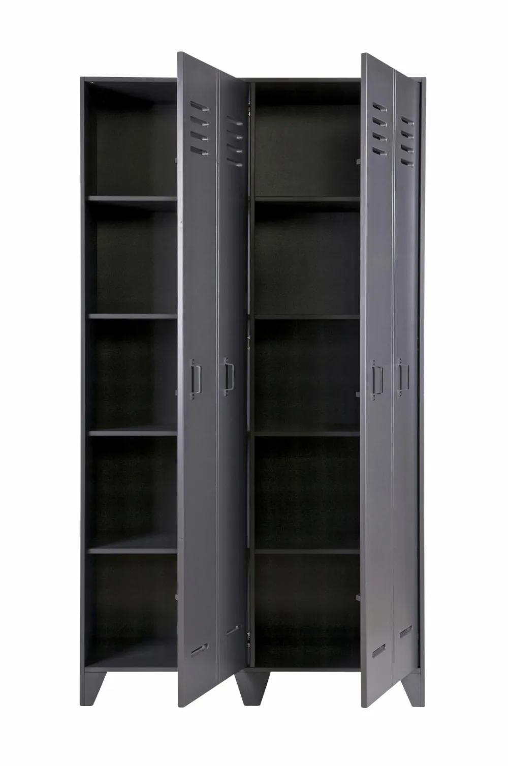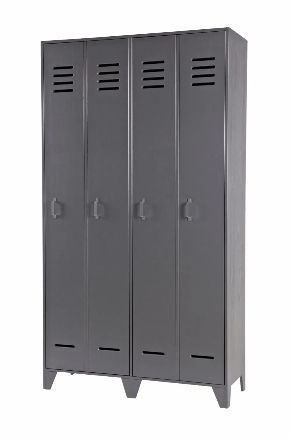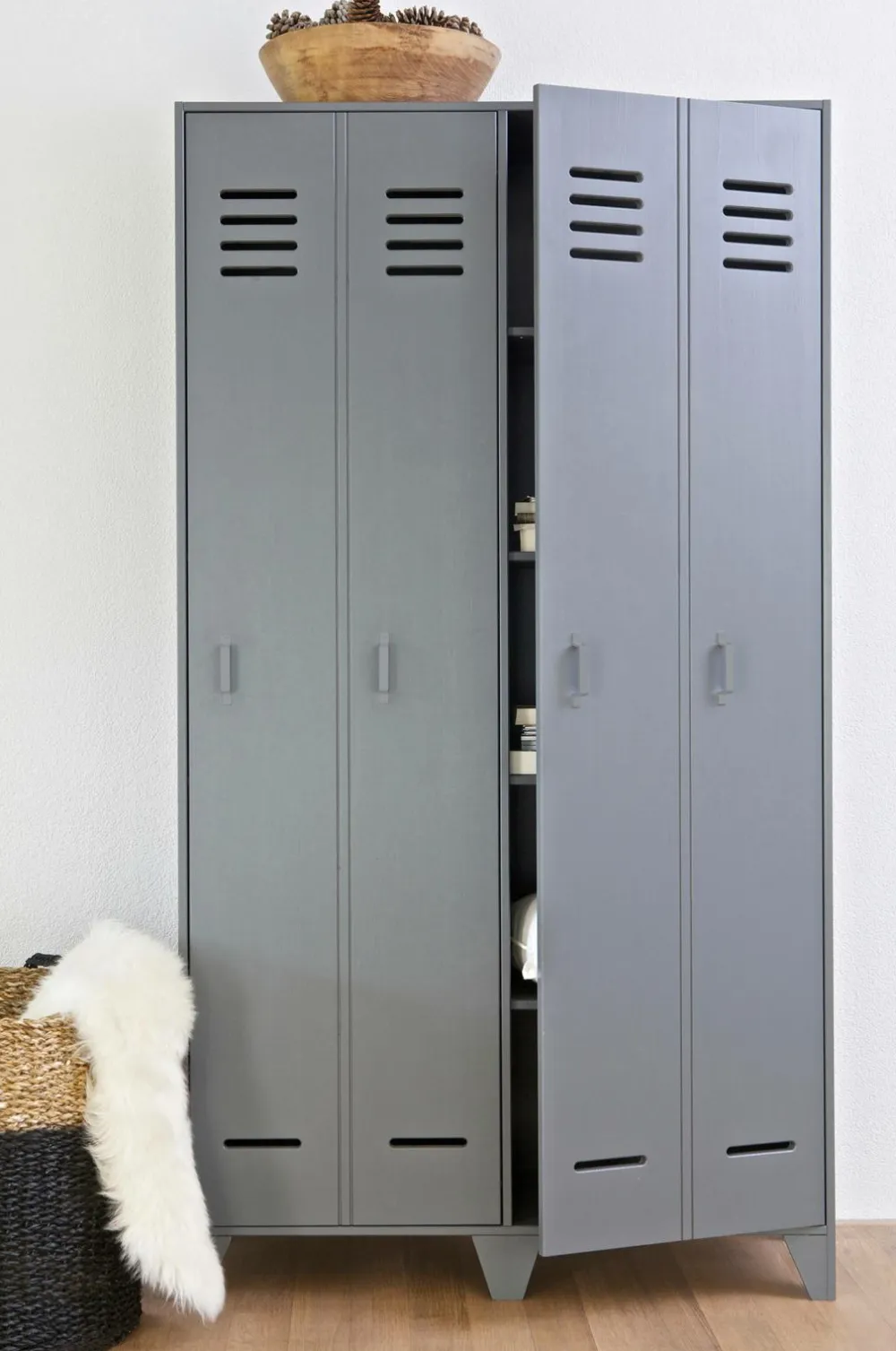 Stijn er en ny serie garderobeskabe fra WOOOD. Det er et robust garderobeskab fremstillet i massivt fyrretræ. Det rummelige garderobeskab med to låger giver god opbevaring. Fire monterede hylder bag hver låge. For at give en fin effekt ser det ud som om skabet har fire låger, men af praktiske årsager er det to større låger. Dette garderobeskab er perfekt til soveværelset, men også meget trendy til f.eks. kontoret.