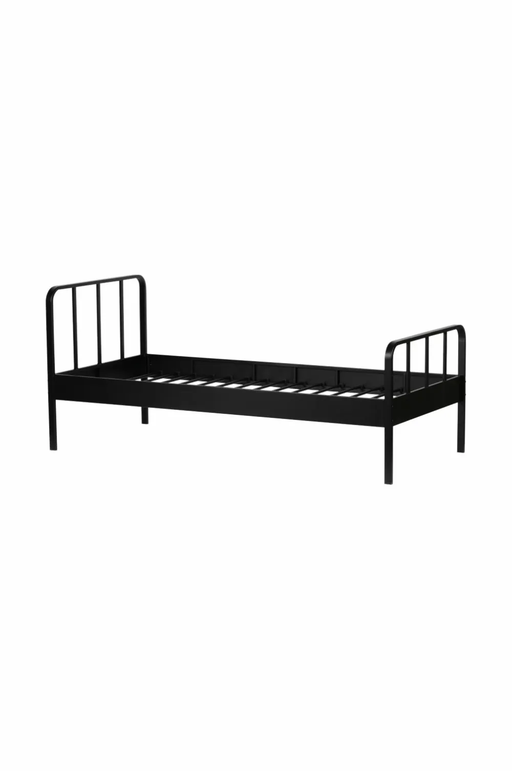 Denne robuste og moderne seng Mees er ny i kollektionen fra WOOOD! Den er et reelt aktiv til ethvert børneværelse! Stellet er af stål med en finish med sort pulverlakering. Lamelbunden er af metal og har 16 lameller. Mees er velegnet til madrasmål 90×200 cm. Sengen leveres uden madras.