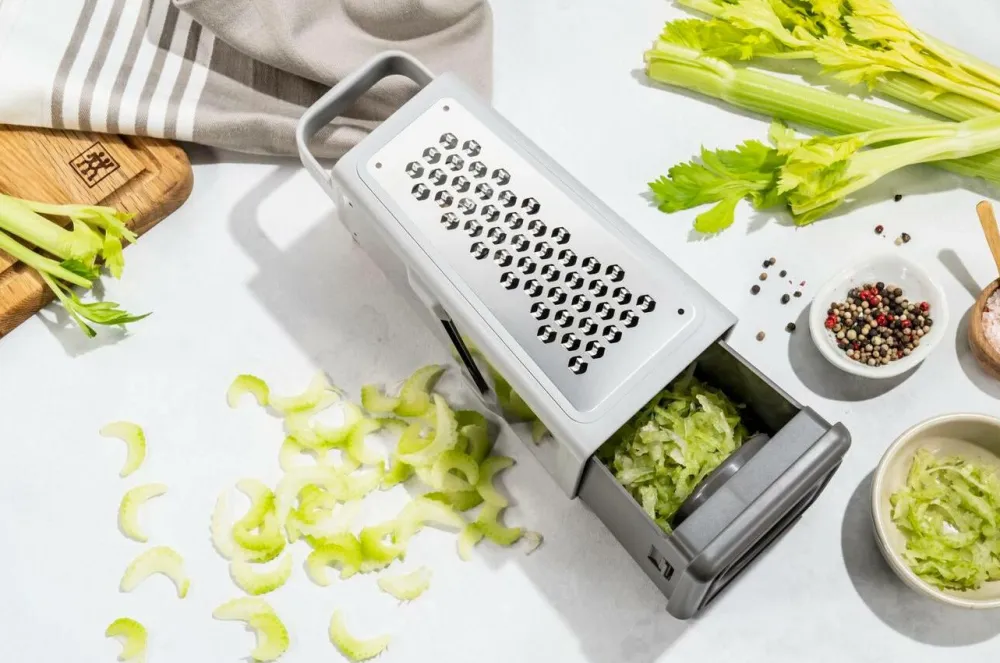 Dette alsidige rivejern giver dig mulighed for at raspe, rive eller skære ost, frugt, grøntsager, nødder og endda chokolade. På de fire flader er der et fint, mellem og groft rivejern samt et dobbeltsidet blad.