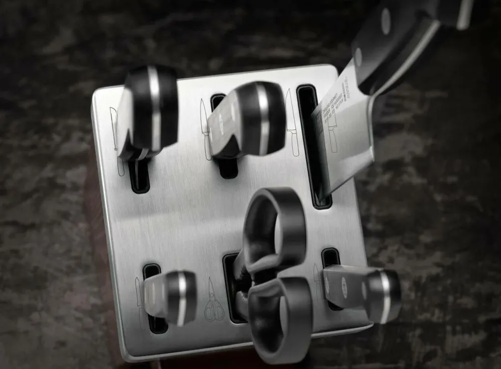 Skarpe knive er sikre knive, fordi du skal bruge mindre kraft for at bruge dem, hvilket mindsker risikoen for at kniven glider. Med den selvslibende knivblok slipper du fuldstændig for manuel slibning, mens du holder dine knive sikre. Hemmeligheden med knivblokken ligger i knivlommerne: To keramiske slibestave er integrerede i lommerne til alle knive uden bølgeskær (urte-, grøntsagt- kød- og kokkeknive). Når GOURMET-knivene trækkes ind og ud, bliver de automatisk slebet og er altid skarpe og klar til brug. Den elegante blok er lavet af asketræ med markante årringe og top i rustfrit stål for øget slidstyrke.