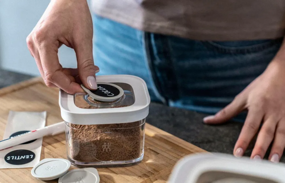 etiketthållaren passar med alla behållare i cube-serien – en stapelbar förvaringsserie med lufttäta lås som håller dina torrvaror fräscha längre, och låter dig smidigt organisera i skafferiet.